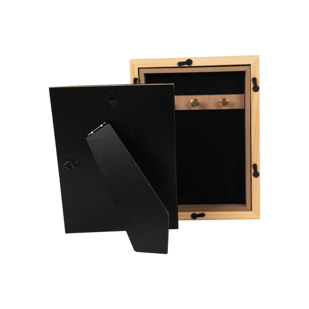 Este marco decorativo es ideal para disimular el almacenamiento de papeles, dinero, llaves, joyas u otros artículos personales. La parte trasera se abre completamente, revelando un espacio oculto con sistema de anclaje interno. Puedes dejarlo sobre una repisa, mesa de noche o colgado en la pared como si fuera cualquier otro cuadro.