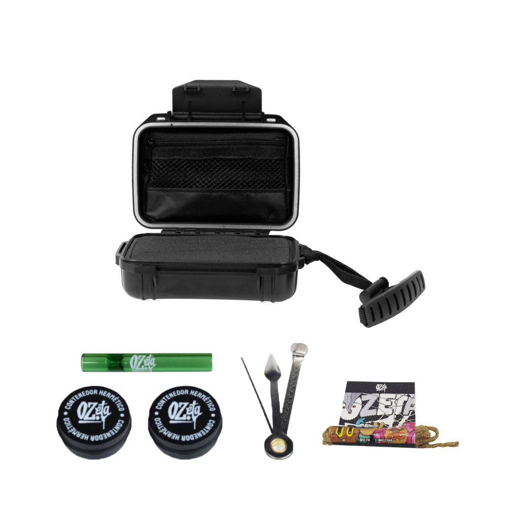 🧰 Incluye Kit Fumeta Pequeño: 1 contenedor hermético, hitter de borosilicato, herramienta metálica triple y mechita OZeta
