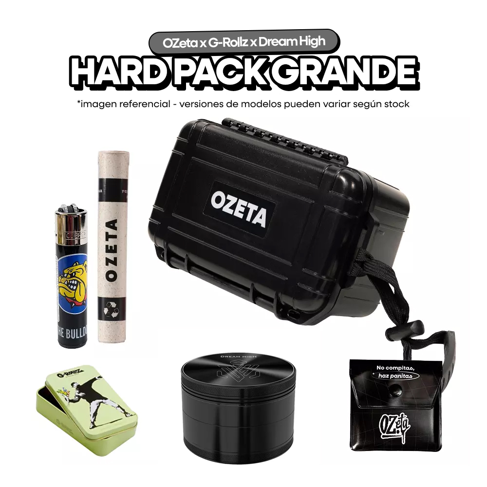 Incluye nuestro Estuche Hard Case Grande OZeta, equipado con cierre hermético y filtros de carbón activado para un control de olores total. Además, viene acompañado de un moledor Dream High aluminio de 63mm de 4 pisos, un porta caños, una cajita metálica G-Rollz, un encendedor Clipper Bulldog y un cenicero portátil OZeta.