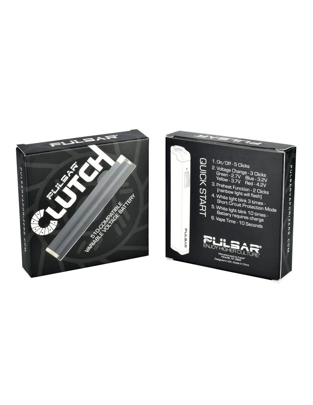 Pulsar Clutch es una batería tipo lapiz rectangular pequeño, delgado y de bolsillo. Tiene regulador de voltaje, una batería interna de 500 mAh y es compatible con todos los cartridges con rosca 510 (thread 510, hilo 510). El cartridge queda expuesto, funciona simplemente con un botón de agarre fácil que permite regular el voltaje y activar el modo de precalentamiento. Tiene una tapa de goma en la base del producto que cubre el conector de cable de carga, cuenta con un cargador de carga rápida USB-C y un apagado automático de seguridad que se activa luego de 10 segundos de uso. No incluye cartridge, se adquiere por separado. ¡Llévalo a donde quieras!